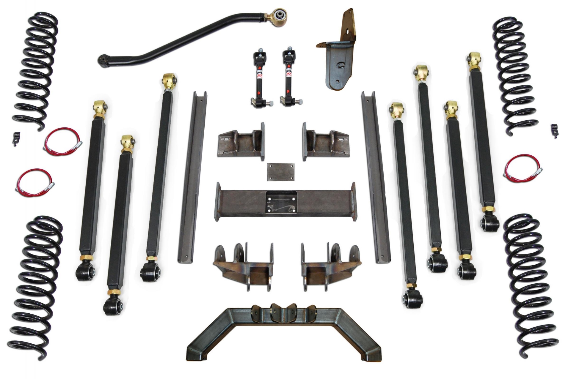 Kit includes, a front 3 piece cross member, unibody rails, rear frame brackets, rear 4 link truss, all 8 adjustable control arms with hardware, front and rear coil springs, front and rear brakelines, front adjustable trackbar and drop bracket, drop pitman arm, front sway bar disconnects and front spring retainers.
