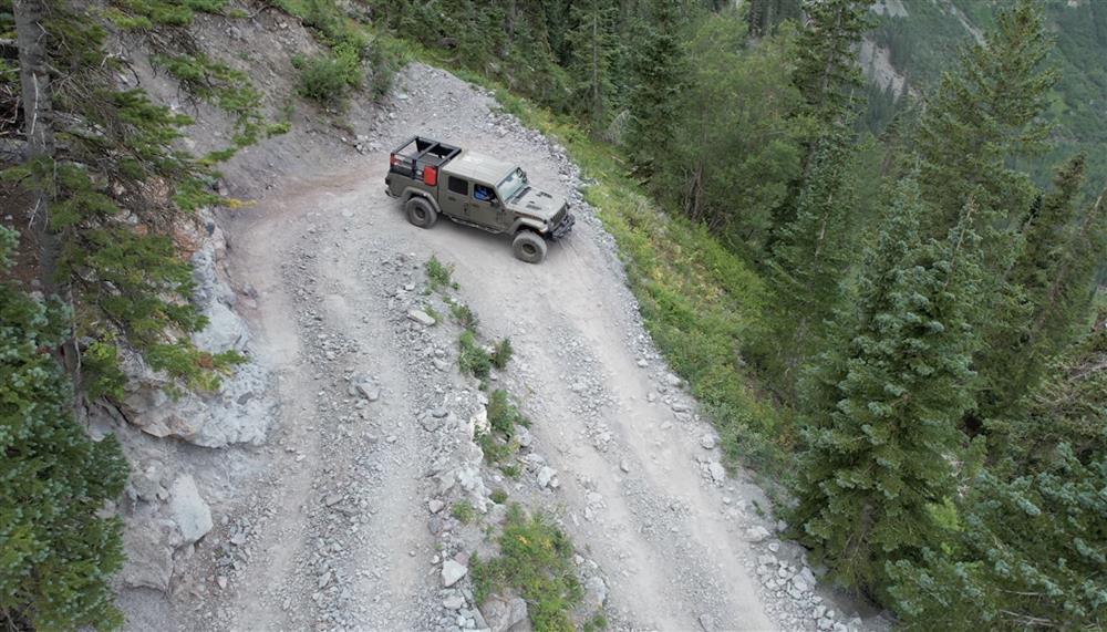 As mentioned, the swithback's are tight; even us 2-door nerds will have to do multi-point turns (unless you have an Atlas T-Case with Dig). Unless you've already done this trail, you've never done switchbacks like these; the drop-offs are legendary and will end you and your rig if you go over. There is no turning around; this is a one-way-trail; once you commit you're descending all the way to Telluride.